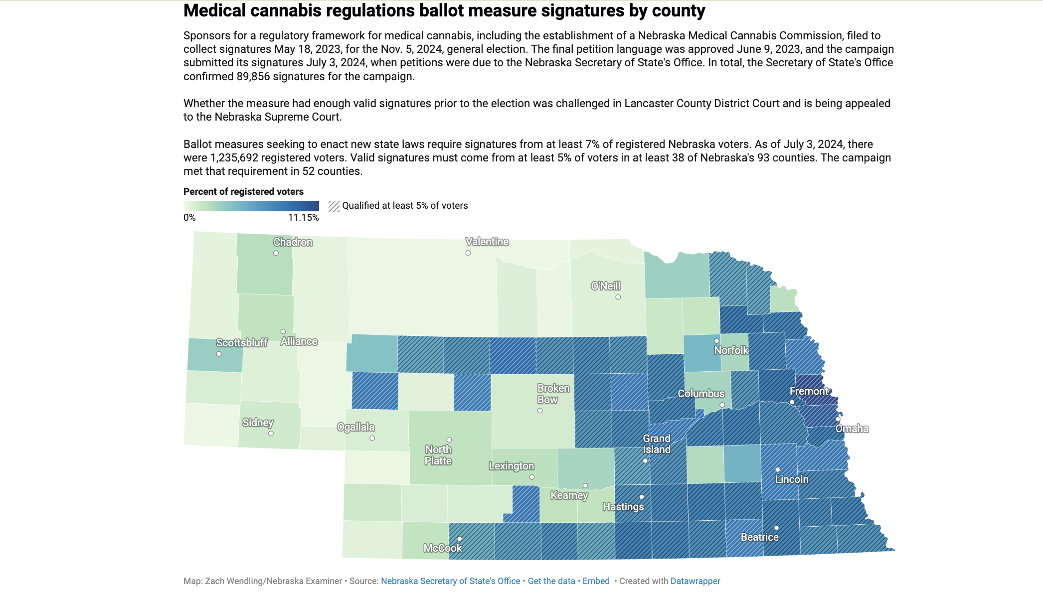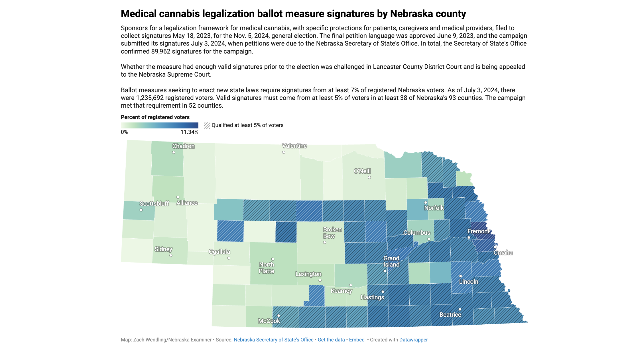 The campaign needed at least 86,499 valid signatures on each of its separate measures. Nebraska Secretary of State Bob Evnen certified 89,962 valid signatures for the one legalizing medical cannabis, and 89,856 for the one regulating it. The case did not address county-specific signature requirements.